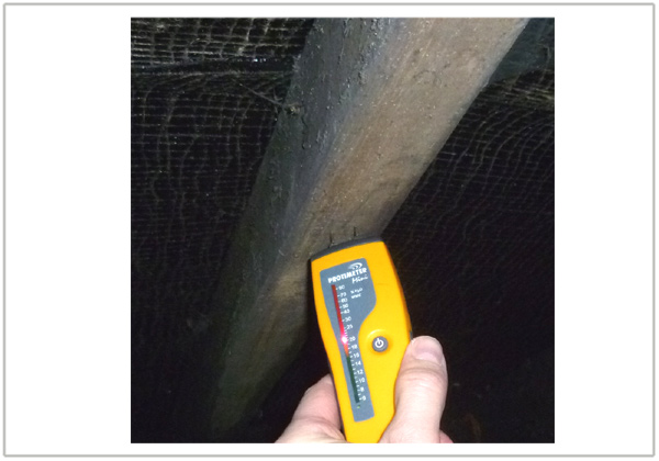 This loft has been air-tight for many years and the roof timbers have become very damp. The meter reading is in the 'red' zone, meaning high water content.